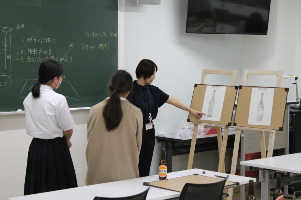 当日は美術科の入試科目でもある「美術科デッサンの体験をしよう!」も同時開催し、本校の美術科教員よりデッサンのポイントをお伝えさせていただきました。