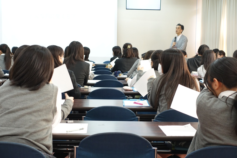 2025年11月6日(木)、幼児教育コース1年生が学園内連携授業の一環として、大阪成蹊短期大学紺谷先生による講義を受講しました。