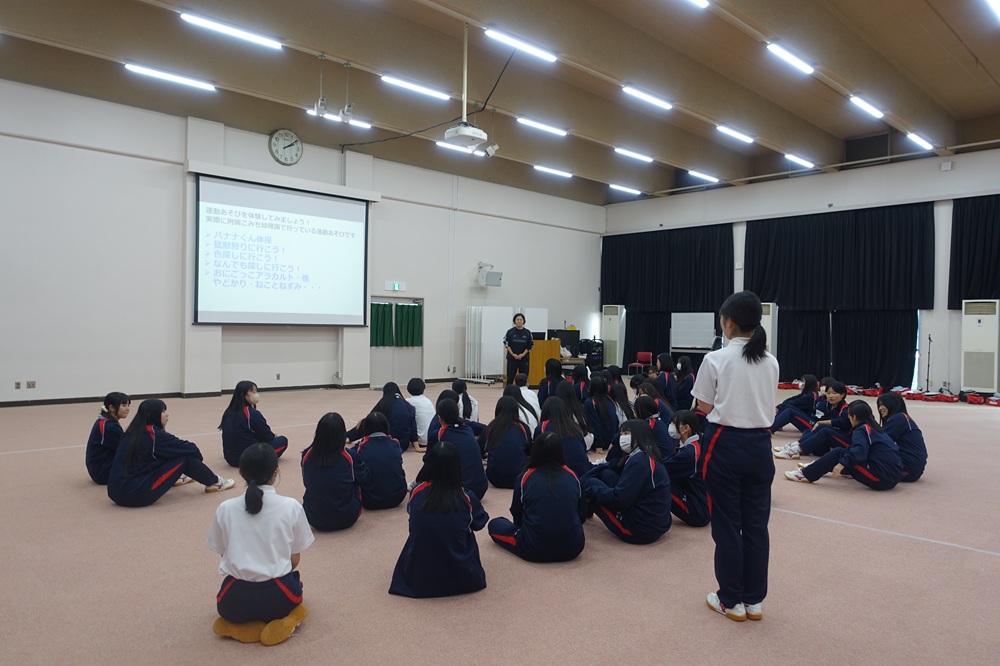 2025年11月12日、幼児教育コース2年生が学園内連携授業の一環として、大阪成蹊短期大学幼児教育学科の塩田先生による「幼児期の運動・体を動かす遊び」についての講義を受講しました。