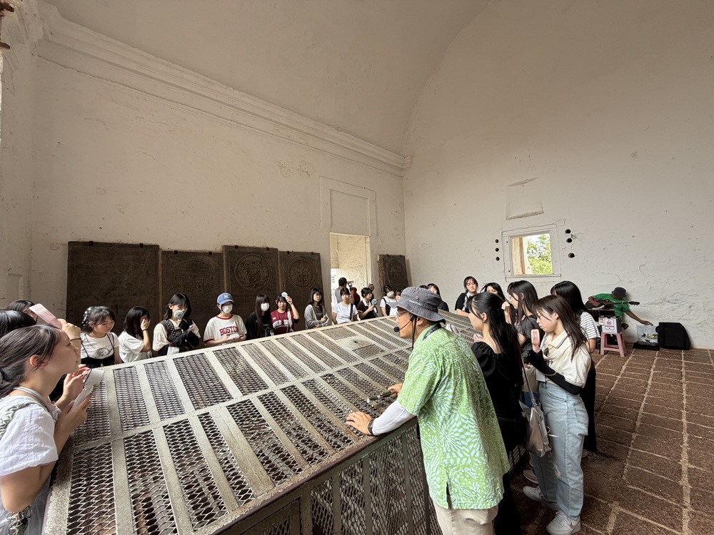 ザビエル像とともに見晴らしのよい丘にたたずむ教会は歴史も古く、その足跡を知ろうと、ガイドさんの説明に皆真剣に耳を傾けていました。