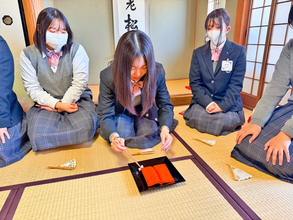 その年の「稽古始め」でもあり、本校の茶道部では、茶道の先生や先輩、後輩との親睦を深めることも目的としています。