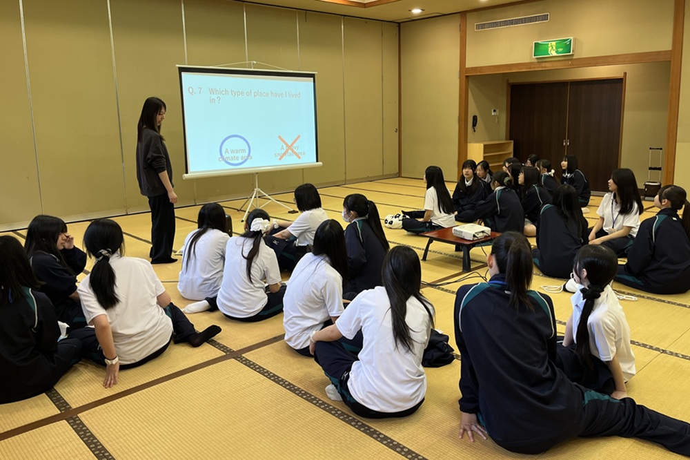 1日目は総合キャリアコースと合同で行った初対面の同級生とのダイアログ、2日目は英語コース独自プログラムとして朝の散歩、ジェスチャーゲームやお互いを知るためのクイズ大会、Chemistry Gameなど、英語を使ったさまざまなプログラムで盛り上がりました。