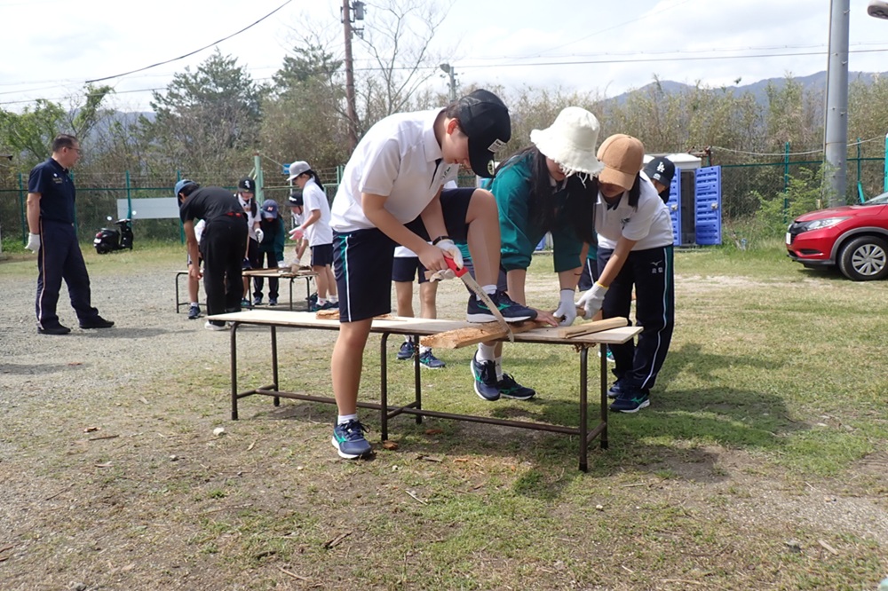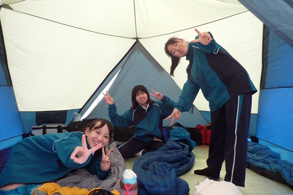 滋賀県の大阪成蹊学園艇庫で、びわこ成蹊スポーツ大学の先生や学生の皆さんのサポートのもと、テントを設営しての野外キャンプや夕食づくり、野外ゲームなどを行いました。